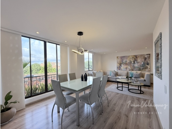 Amplio acogedor e iluminado apartamento duplex totalmente remodelado con excelentes acabados, área 141m, distribuidos así: Primer nivel: Dos salas, una con chimenea, la sala principal con licorera, comedor independiente con balcón, baño social, escaleras en madera con luces indirectas, cocina abierta con lavavajillas y herrajes especiales, zona de ropas independiente, depósito interior. Segundo nivel: 3 alcobas, holl de alcobas, estudio, baño de alcobas, alcoba principal con balcón vestier y baño. El apartamento cuenta con cortinas eléctricas y luces indirectas. Dos parqueaderos independientes y un depósito.